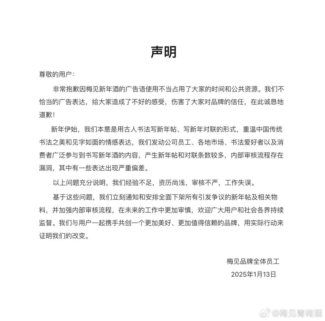 酒食新消費(fèi)注意到,面對(duì)公眾的質(zhì)疑,梅見青梅酒的官方微博已于1月13日發(fā)布聲明,向消費(fèi)者誠(chéng)懇道歉,承認(rèn)廣告語(yǔ)使用不當(dāng),表示對(duì)此深表歉意。