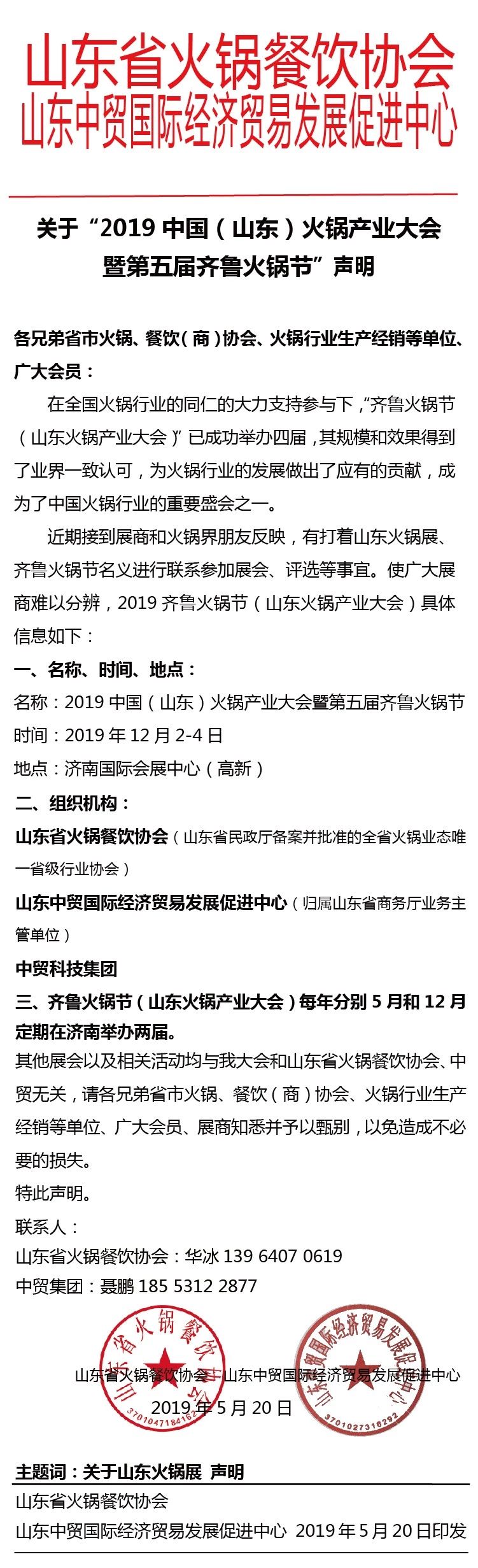 2019中國(guó)(山東)火鍋產(chǎn)業(yè)大會(huì)暨第五屆齊魯火鍋節(jié)官方聲明